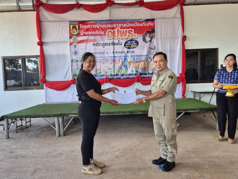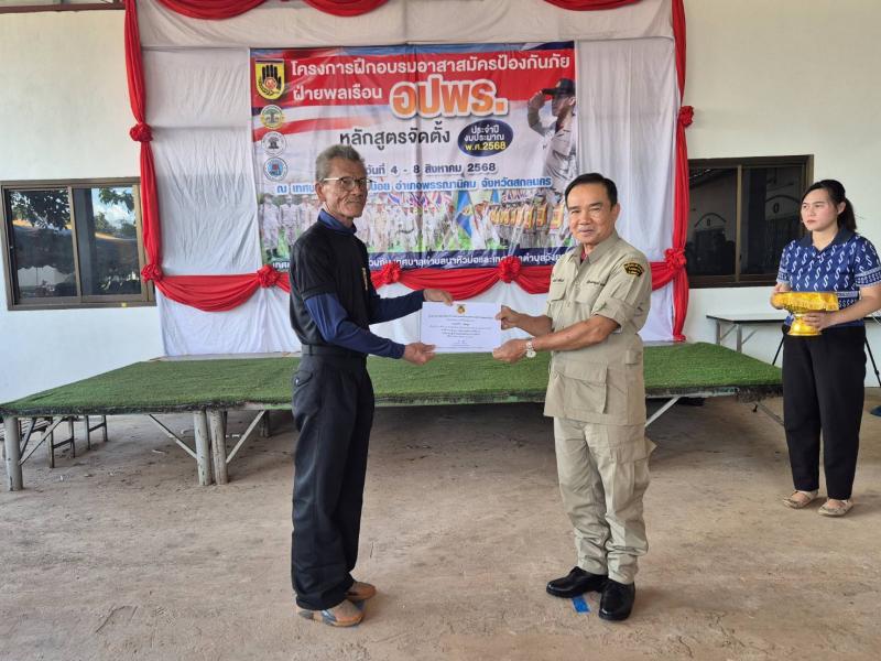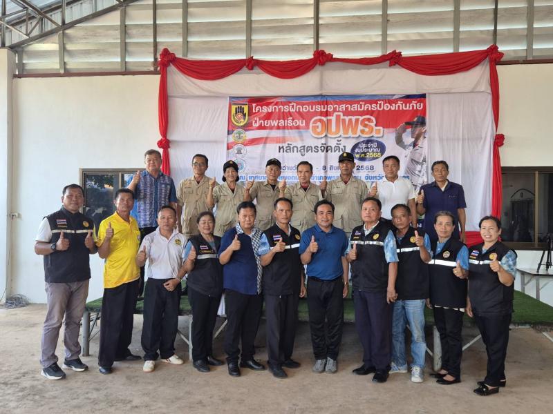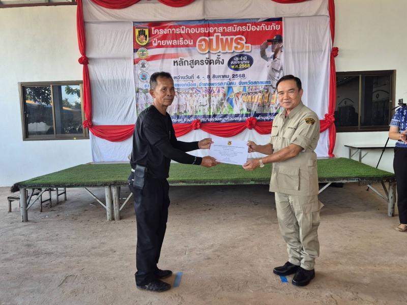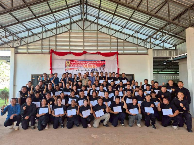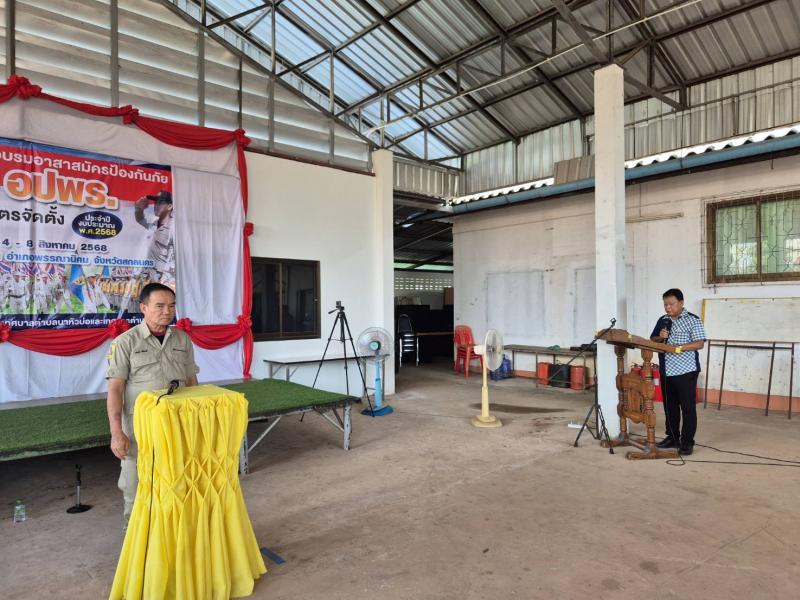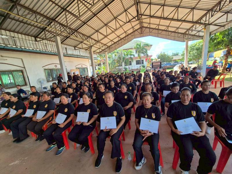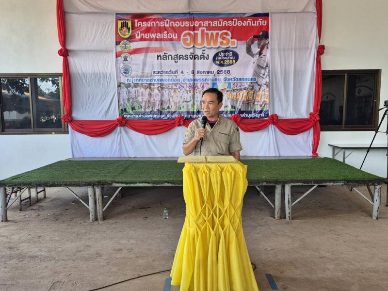 ท่านนายกเสน่ห์ วจีสิงห์ นายกเทศมนตรีตำบลพอกน้อย ประธานในพิธีปิดโครงการฝึกอบรมอาสาสมัครป้องกันภัยฝ่ายพลเรือน (อปพร.) หลักสูตรจัดตั้ง