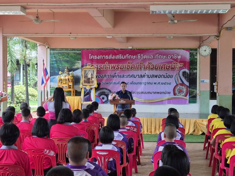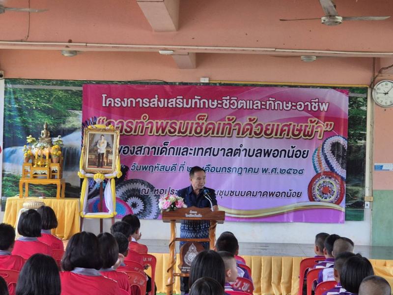 เทศบาลตำบลพอกน้อย นำโดย ท่านนายกเสน่ห์ วจีสิงห์ นายกเทศมนตรีตำบลพอกน้อย ประธานในพิธี ร่วมโครงการส่งเสริมทักษะชีวิตและทักษะอาชีพ “การทำพรมเช็ดเท้าด้วยเศษผ้า