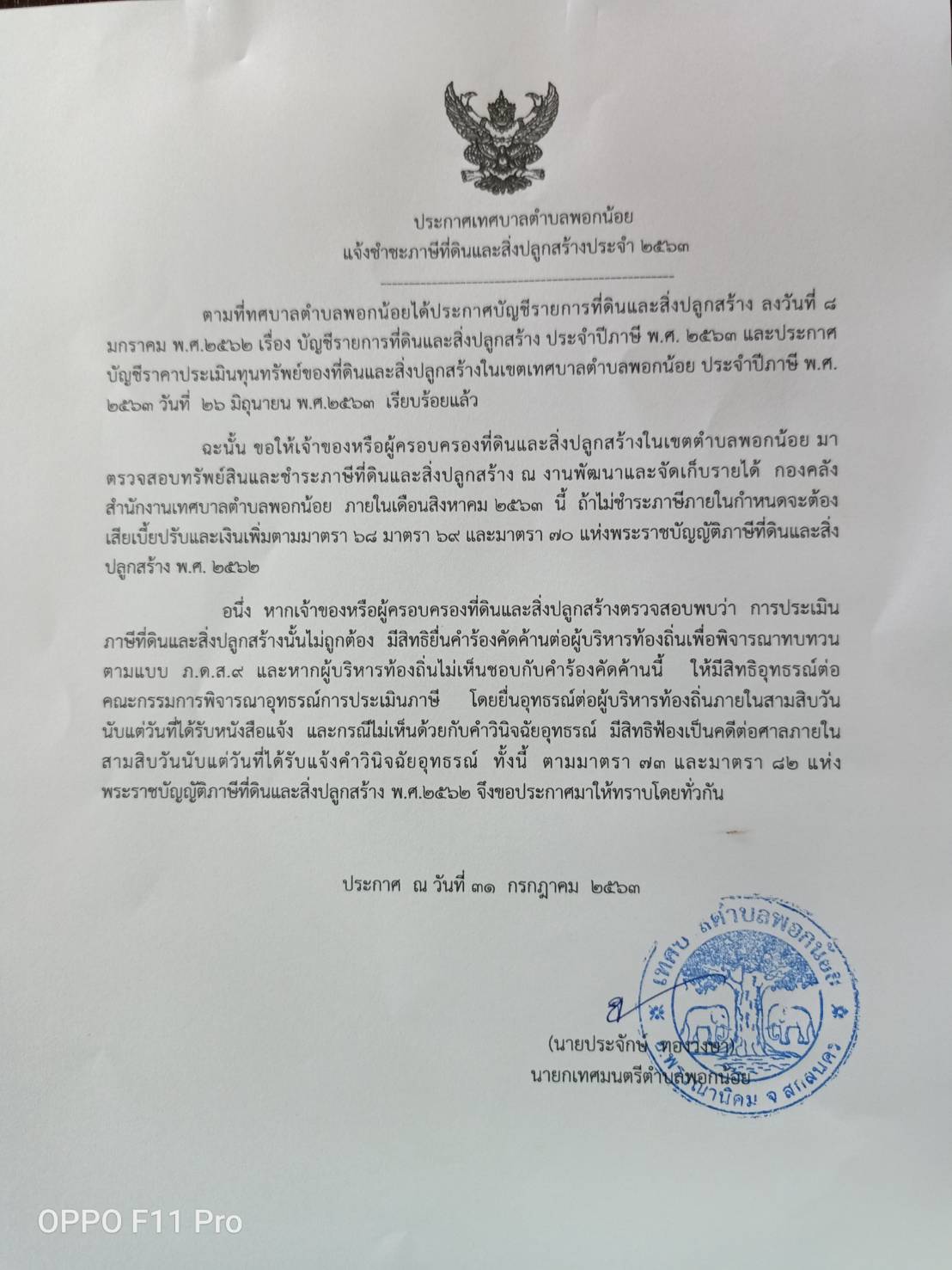 การออกให้บริการแจ้งและรับชำระภาษีที่ดินและสิ่งปลูกสร้าง นอกสถานที่ ของเทศบาลตำบลพอกน้อย ประจำปี พ.ศ.2563