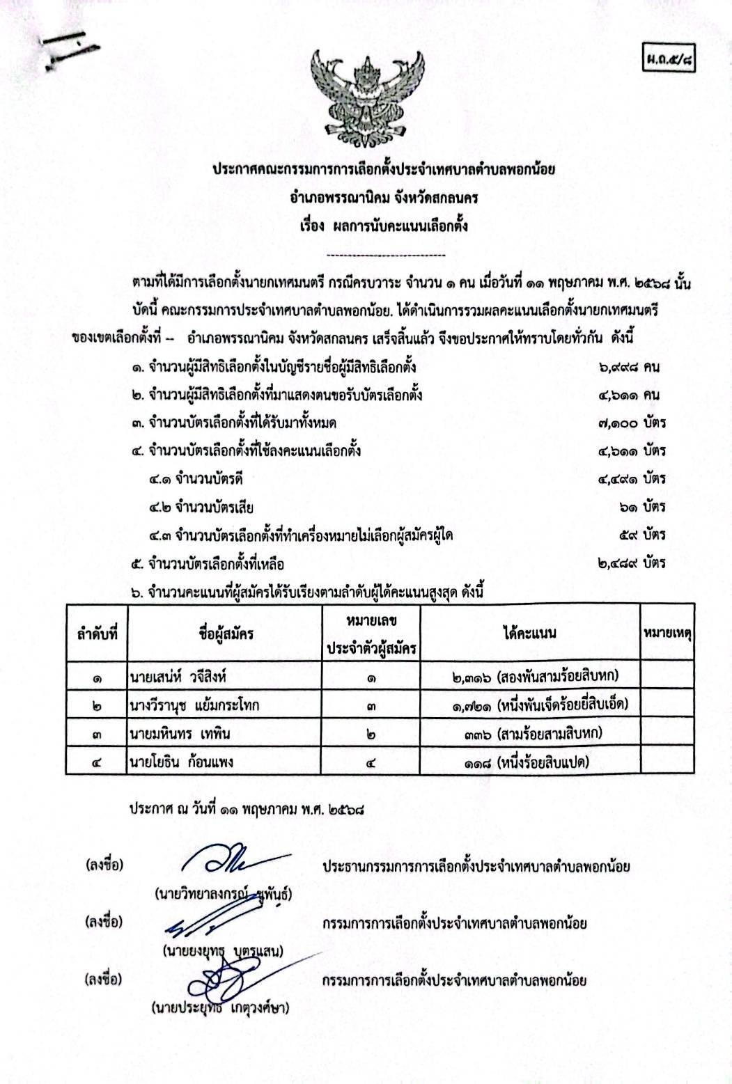 ประกาศคณะกรรมการการเลือกตั้งประจำเทศบาลตำบลพอกน้อย เรื่องผลการนับคะแนนเลือกตั้ง (นายกฯ)