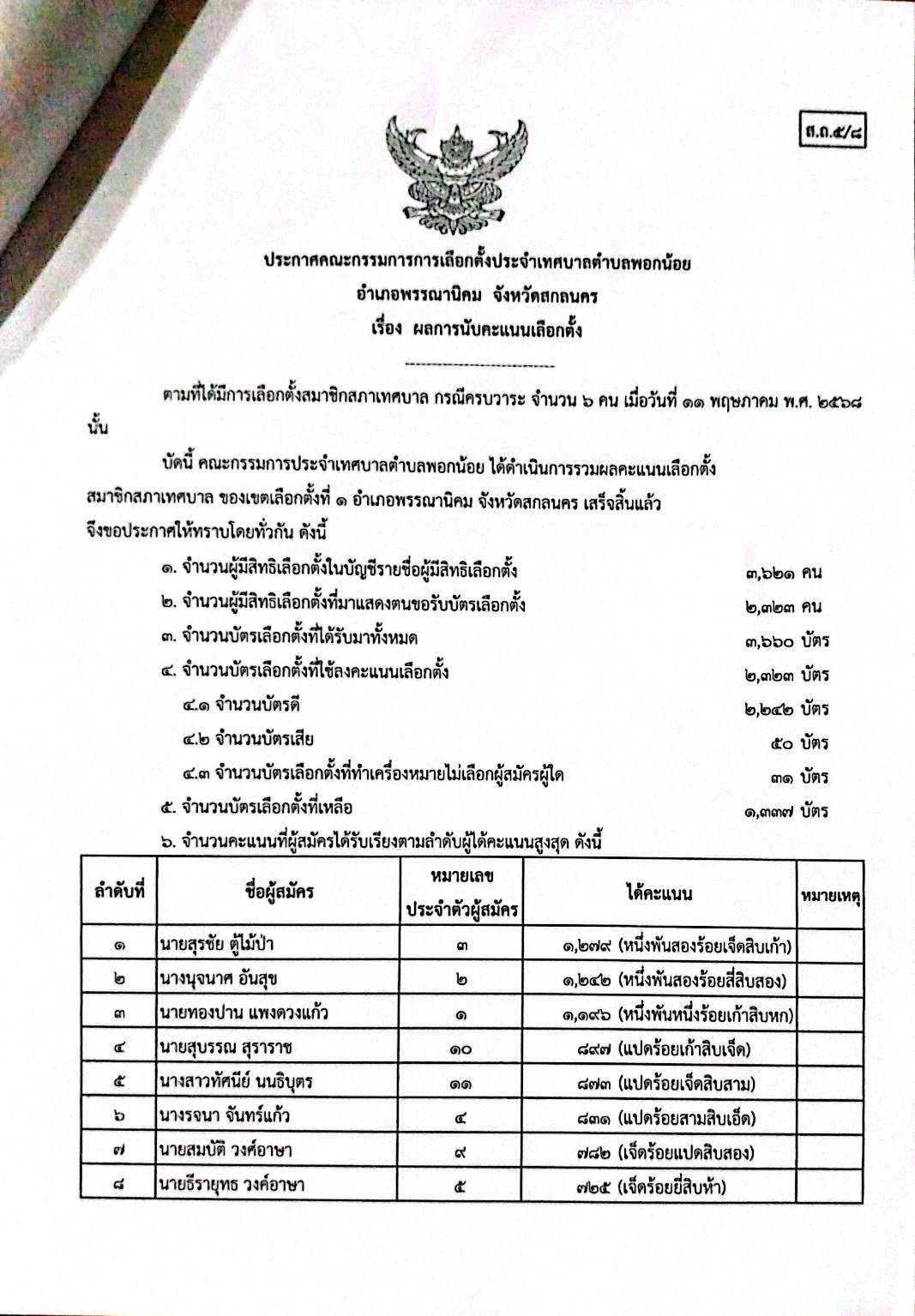 ประกาศคณะกรรมการการเลือกตั้งประจำเทศบาลตำบลพอกน้อย เรื่องผลการนับคะแนนเลือกตั้ง (สมาชิกสภาฯ เขตเลือกตั้งที่ 1)