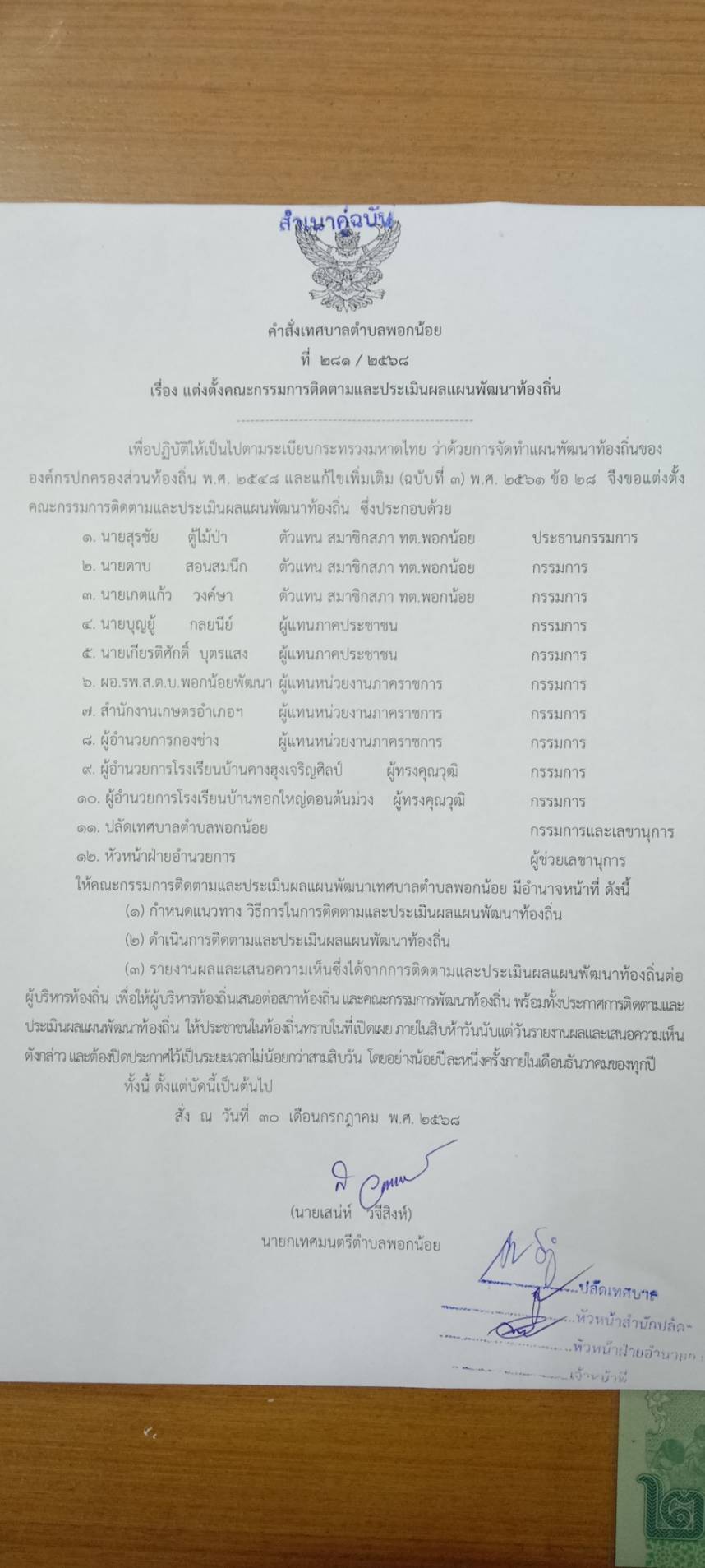 คำสั่งแต่งตั้งคณะกรรมการติดตามและประเมินผลแผนพัฒนาท้องถิ่น
